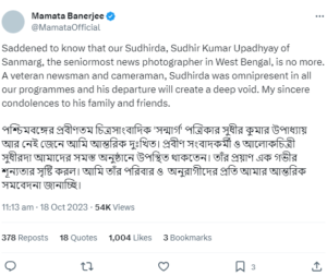 প্রখ্যাত চিত্রসাংবাদিক সুধীর কুমার উপাধ্যায়ের প্রয়াণে শোকার্ত মুখ্যমন্ত্রী মমতা বন্দ্যোপাধ্যায়। তিনি তাঁর এক্স হ্যান্ডেলে শোকবার্তা জানিয়ে লিখেছেন, “পশ্চিমবঙ্গের প্রবীণতম চিত্রসাংবাদিক ‘সন্মার্গ’ পত্রিকার সুধীর কুমার উপাধ্যায় আর নেই জেনে আমি আন্তরিক দুঃখিত। প্রবীণ সংবাদকর্মী ও আলোকচিত্রী সুধীরদা আমাদের সমস্ত অনুষ্ঠানে উপস্থিত থাকতেন। তাঁর প্রয়াণ এক গভীর শূন্যতার সৃষ্টি করল। আমি তাঁর পরিবার ও অনুরাগীদের প্রতি আমার আন্তরিক সমবেদনা জানাচ্ছি।” ইভিএম নিউজ