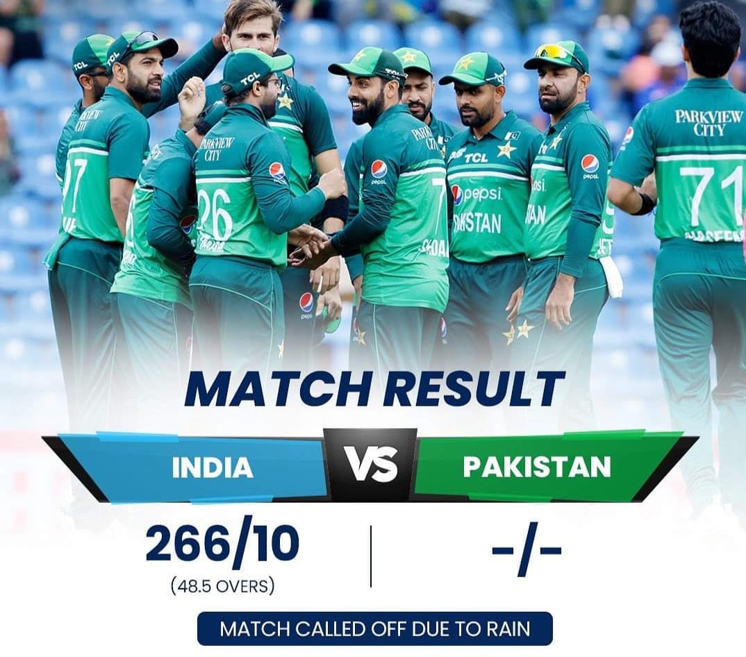 মূলত ঈশানের ৮১ বলে ৮২ ও হার্দিকের ৯০ বলে ৮৭ রানের উপর ভর করেই ভারত ২৬৬ রানের লক্ষ্য গড়ে তুলতে সক্ষম হয়। তবে পাকিস্তানের ইনিংস শুরুর আগে ঘটে বিপত্তি। বৃষ্টির কারণে বেশ খানিকক্ষণ ম্যাচ বন্ধ থাকার পর সিদ্ধান্ত নেওয়া হয় ম্যাচ পরিত্যক্ত। তারপরই নিয়মানুযায়ী পয়েন্ট ভাগাভাগি হয়ে যায় দুই দলের মধ্যে। প্যাভিলিয়নেই করমর্দন সারেন বিরাট, বাবররা। ইভিএম নিউজ