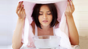 গরম ভেপার নিন। একটি বড় পাত্রে জল গরম করুন। তারপর আপনার মুখের চারপাশে বাষ্প আটকাতে তোয়ালে ব্যবহার করুন। যতক্ষণ না আপনি স্বস্তি পান ততক্ষণ (গরম জলের বাষ্প) ভেপার নিতে পারেন। তাপ বেশি হলে তোয়ালে সরিয়ে দিন, কারণ বেশি তাপ আপনার মুখের ত্বকের জন্য ক্ষতিকর।