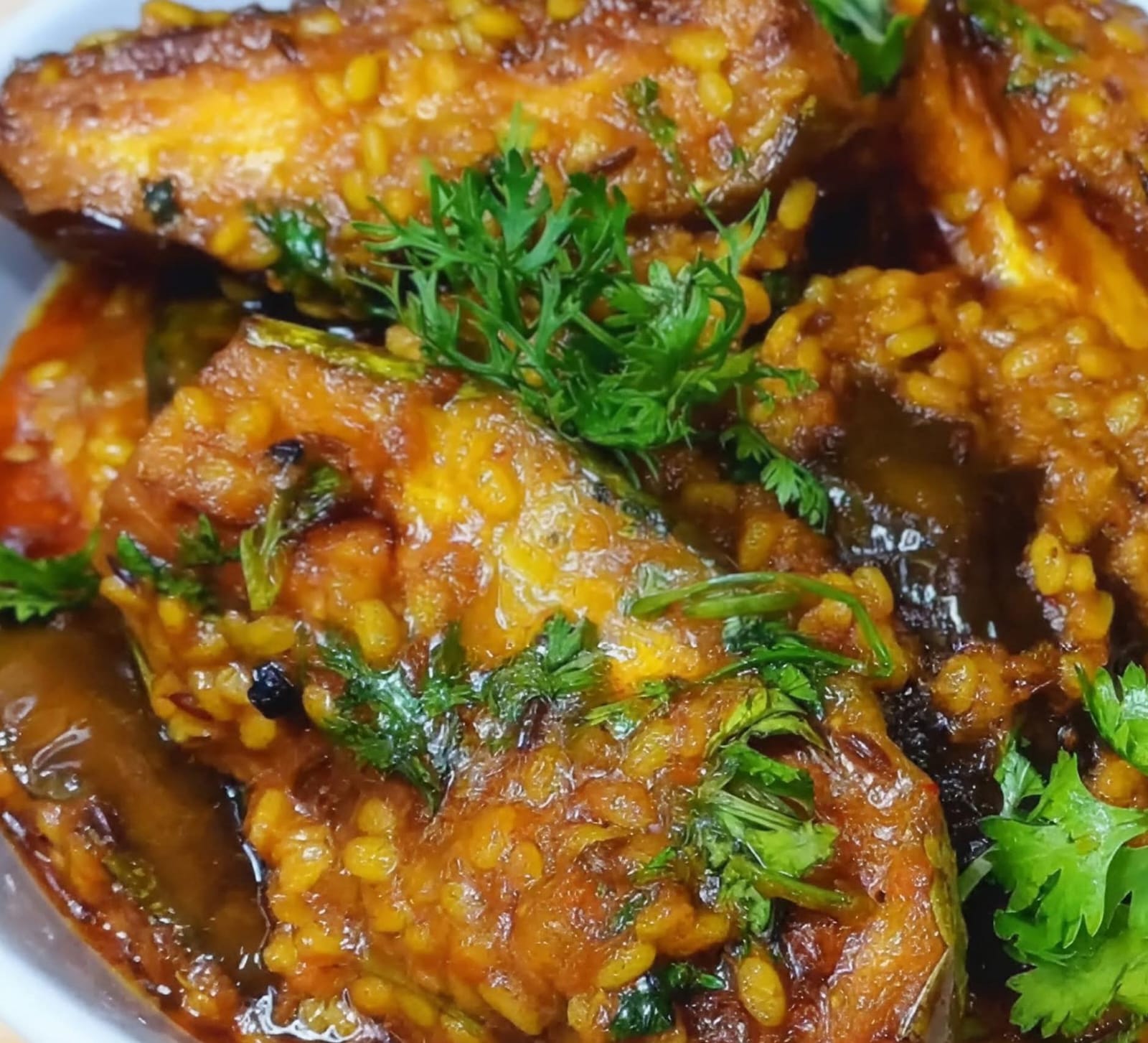 ১. প্রথমে আধা কাপ মুগ ডাল ৩০ মিনিট গরম জলে ভিজিয়ে রাখুন। ২. ২টো বড় সাইজের বেগুন সামান্য লম্বা রেখে বড় বড় করে কেটে নিন। ৩. একটি বাটিতে ২ চামচ টক দইয়ের সাথে সামান্য হলুদ গুঁড়ো, ঝাল লঙ্কার গুঁড়ো, কাশ্মীরি লঙ্কার গুঁড়ো, সামান্য লবণ, ১ চামচ জিরের গুঁড়ো, ১ চামচ ধনের গুঁড়ো, আধা চামচ গরম মশলার গুঁড়ো ও সামান্য চিনি মিশিয়ে নিন। এই মিশ্রণটি ৫ মিনিট রেখে দিন। ৪. তেল গরম করে, লবণ ছাড়া হলুদ গুঁড়ো মাখিয়ে বেগুনগুলো হালকা ভেজে তুলে নিন। ৫. এবার ওই তেলেই ফোড়ন দিন লবঙ্গ, গোলমরিচ, এলাচ, দারচিনি, আস্ত জিরে, শুকনো আস্ত লঙ্কা ও তেজপাতা। হালকা ভেজে নিন। ৬. এবার ২ চামচ আদা ও লঙ্কার পেস্ট এবং টমেটোর পেস্ট দিয়ে ভালো করে কষিয়ে নিন। ৭. এরপর ভেজানো মুগ ডাল দিয়ে আরও ২ মিনিট ভাজুন। ৮. ভেজে রাখা দই সহ মশলার মিশ্রণটি দিয়ে আবারও কষিয়ে নিন। ৯. ২ কাপ গরম জল ও স্বাদ মতোন লবণ দিয়ে কম আঁচে ঢেকে ডাল সিদ্ধ করুন। ১০. ডাল সিদ্ধ হয়ে এলে ভাজা বেগুনগুলো দিয়ে দিন, সামান্য চিনি দিন এবং আবারো ঢেকে ২ মিনিট রান্না করুন। ১১. বেগুন সহ মুগ ডাল ও মশলার মিশ্রণ মাখো মাখো হয়ে গেলে ১ চামচ ঘি ও কুচানো ধনেপাতা মিশিয়ে দিন।